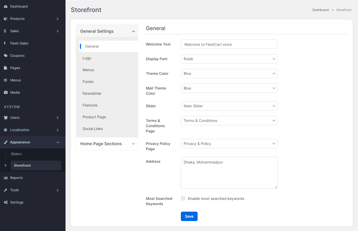 - Theme: Select theme for the storefront.