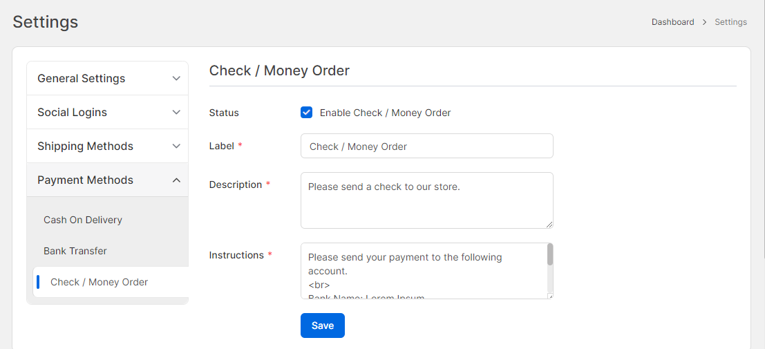 - Instructions (translatable): Check / Money Order instructions will be shown on the checkout page
